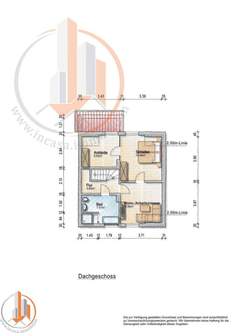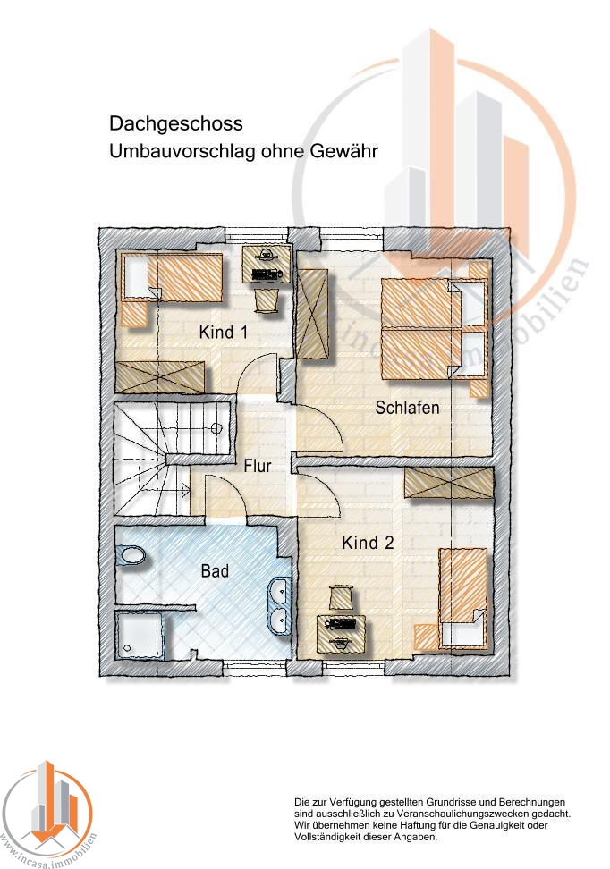 Im Obergeschoss stehen weitere Kinder- und Schlafzimmer sowie ein zusätzliches Duschbad zur Verfügung. Ideal für die Bedürfnisse einer Familie. Durch kleine Grundrissanpassungen und die Erneuerung der Treppe lassen sich hier drei separate Räume schaffen, sodass noch mehr Wohnfläche sinnvoll genutzt werden kann. Dies haben wir schon in einem Grundrissbeispiel dargestellt.